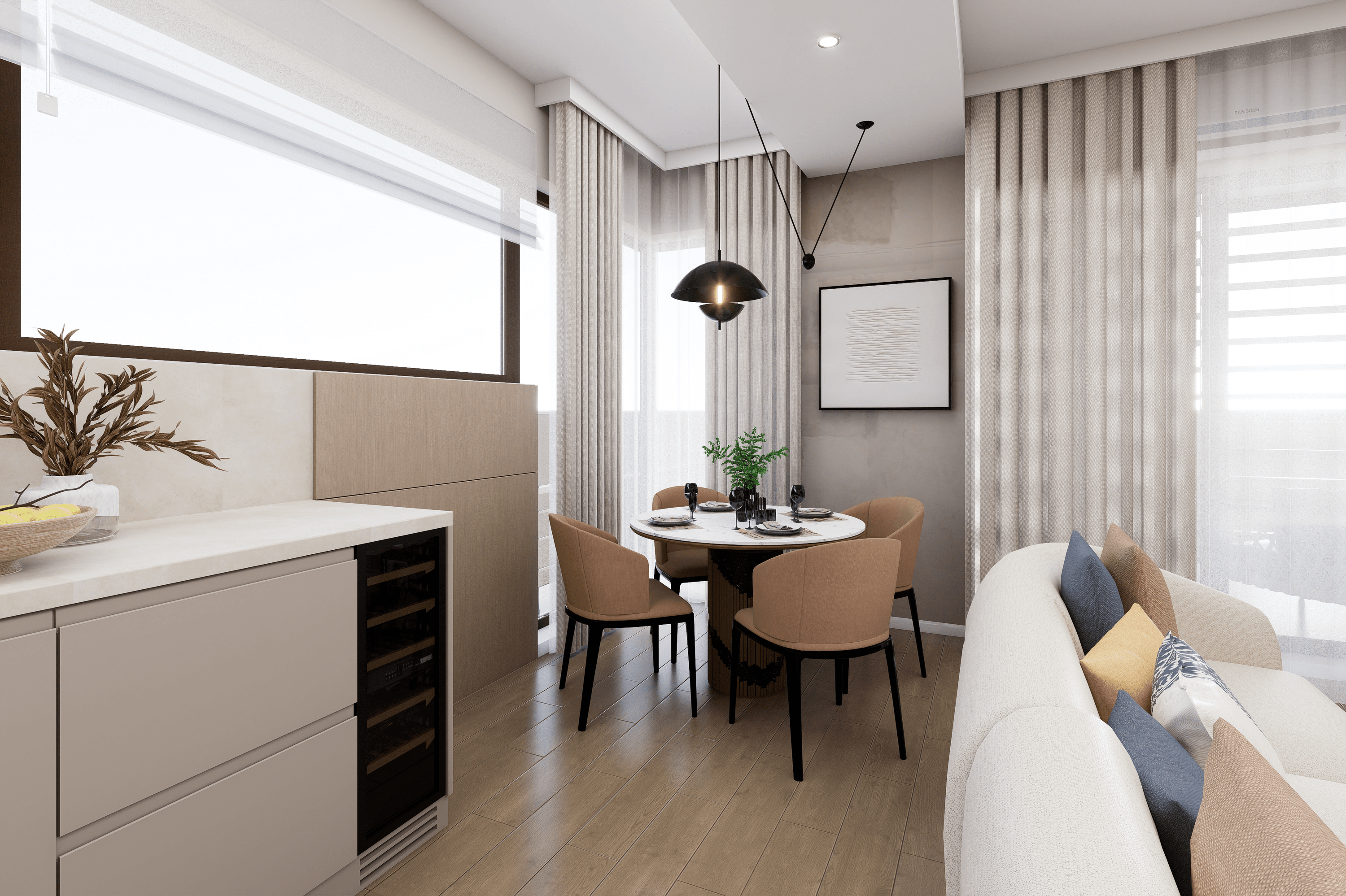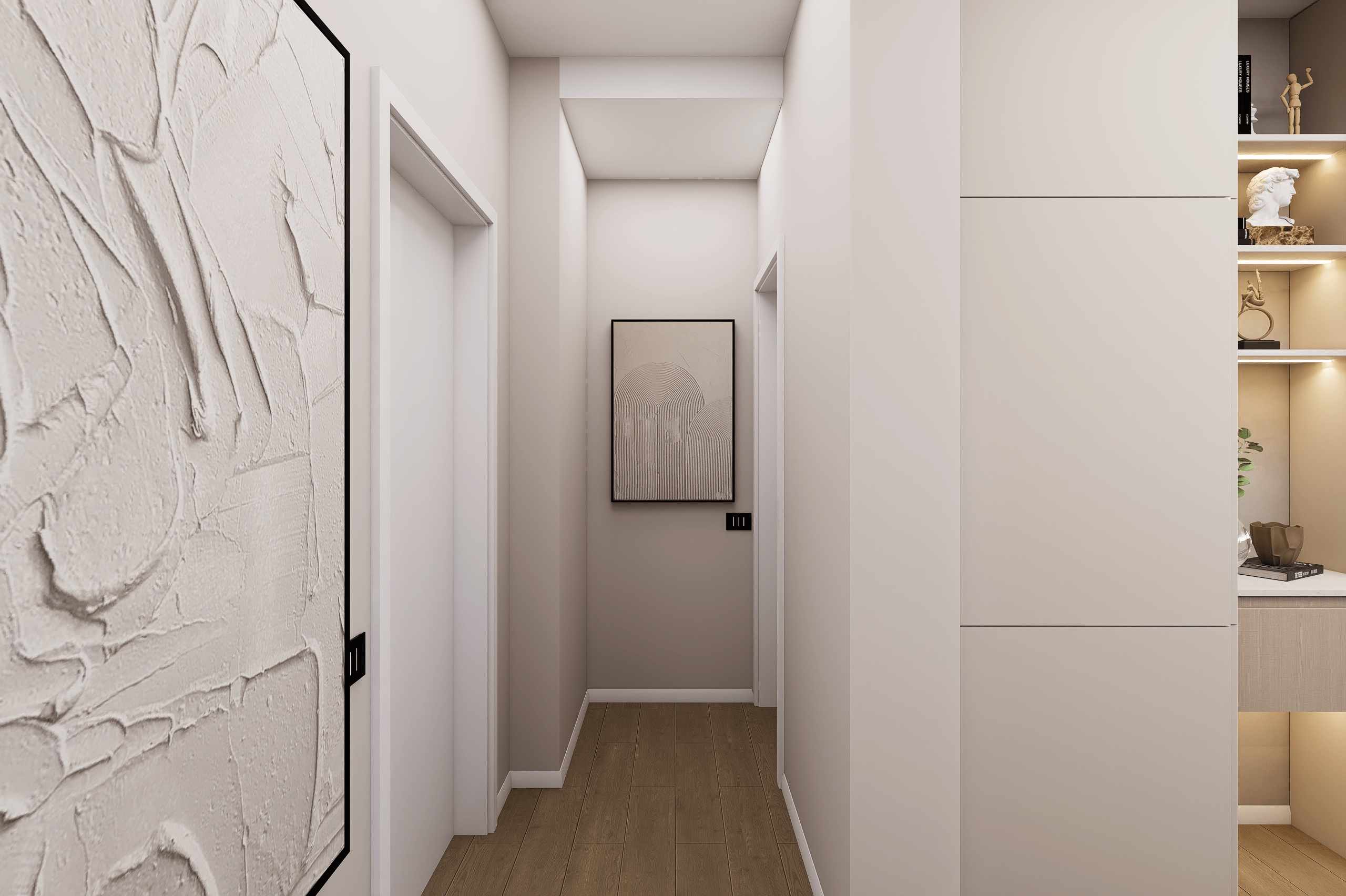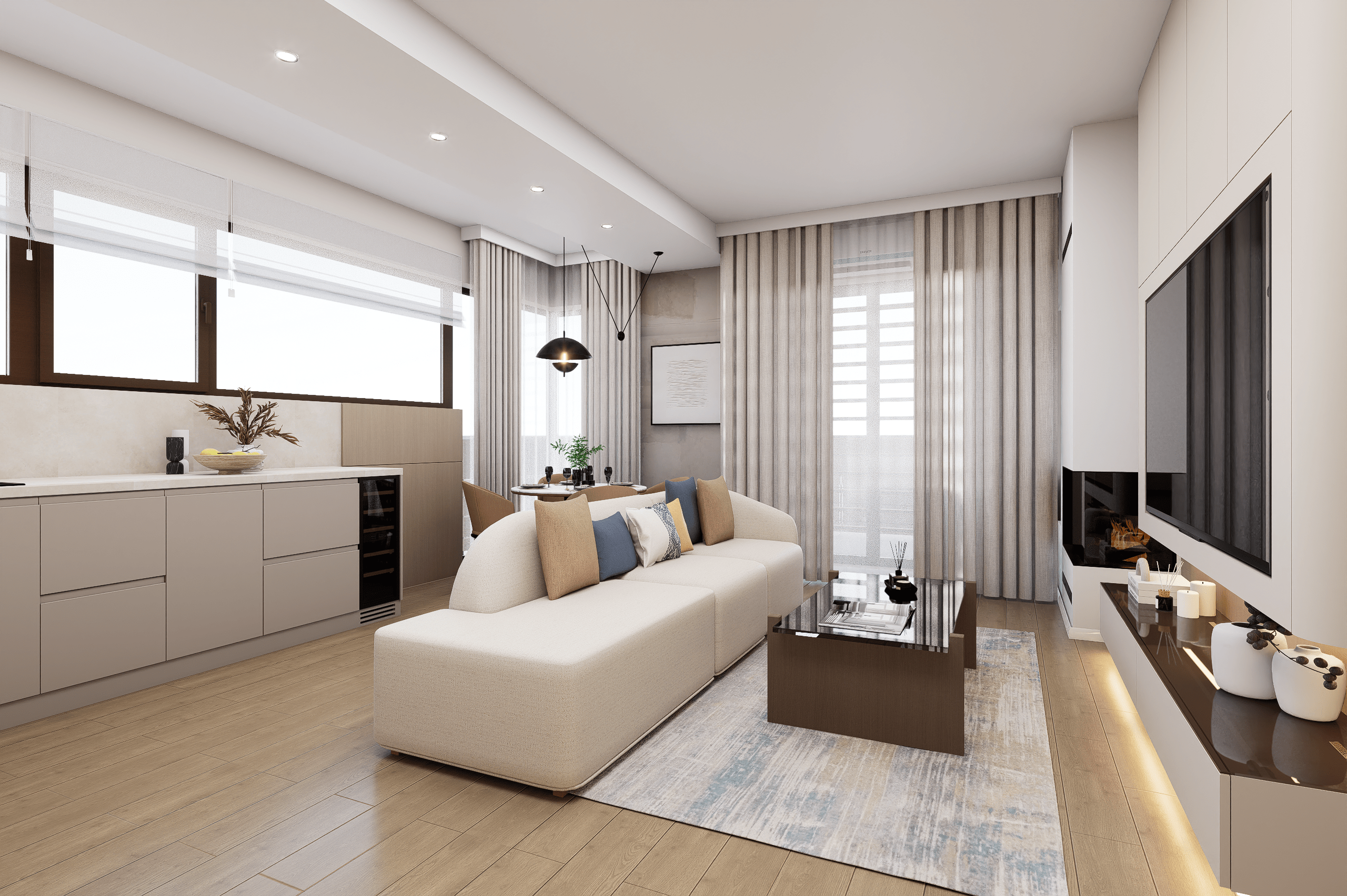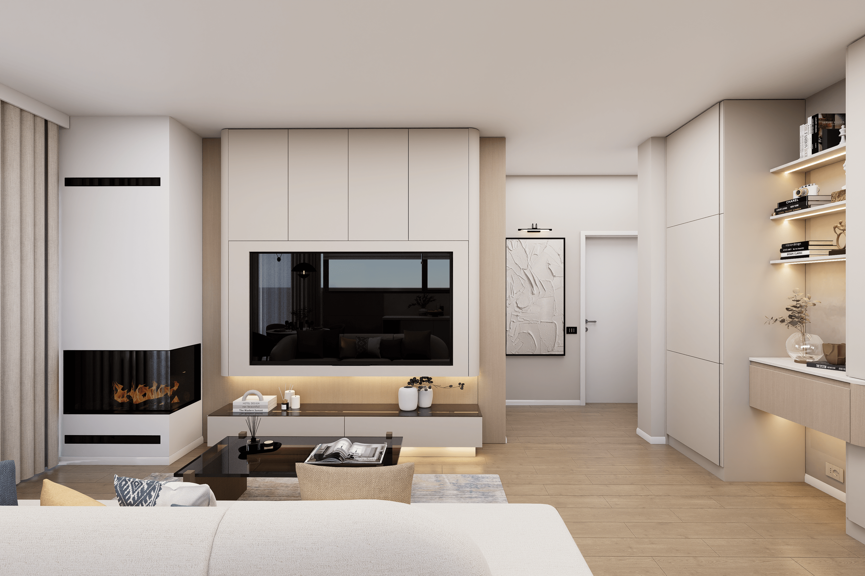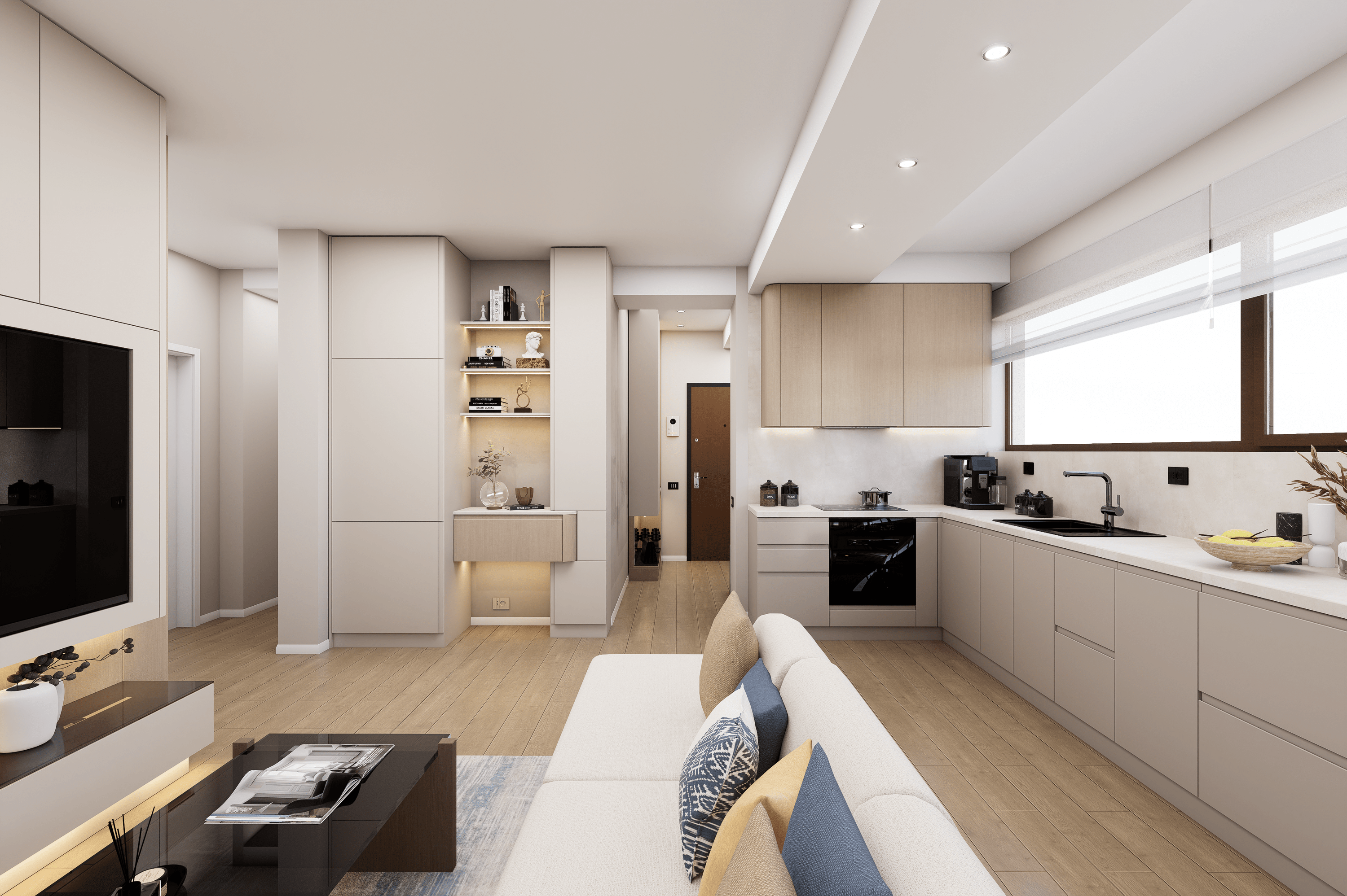 Acest proiect reprezintă o interpretare elegantă a minimalismului cald, unde liniile curate și tonurile neutre conturează un spațiu calm, coerent și extrem de funcțional. Livingul și bucătăria se unesc într-un open-space luminos, configurat pentru a maximiza confortul zilnic și pentru a crea o atmosferă primitoare.