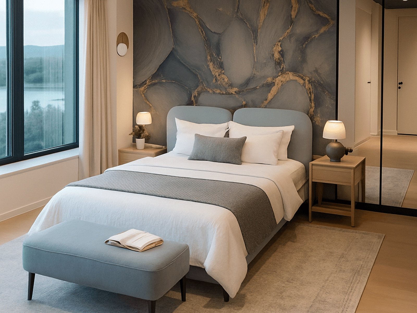Trecând în dormitor, suntem întâmpinați de un spațiu generos și bine organizat. Patul, situat central, domină scena, însă permite totodată amenajarea unei zone de beauty în spatele său. Aceasta este separată de zona de odihnă printr-un separator fix de cameră, asigurând astfel intimitatea necesară. În ansamblu, dormitorul reușește să creeze un echilibru armonios între funcționalitate și estetică, oferind o atmosferă relaxantă și confortabilă.