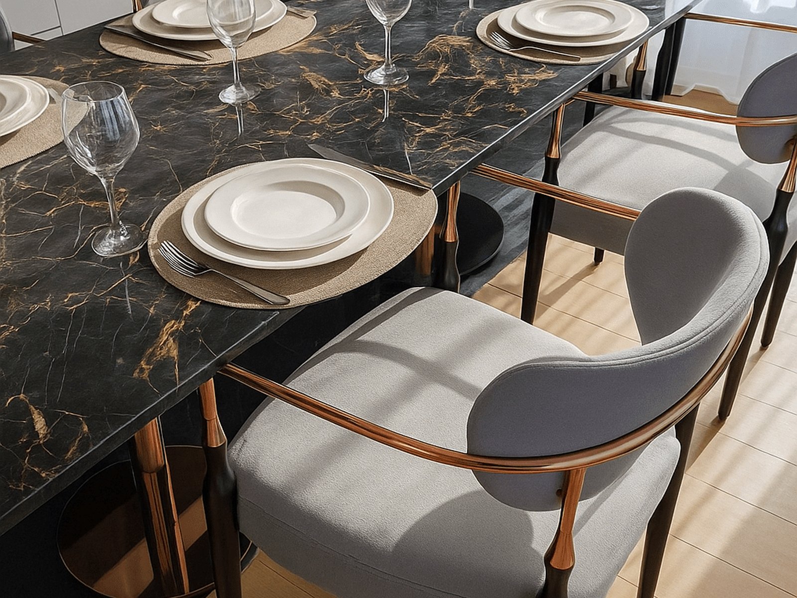 Aceste detalii metalice nu numai că aduc un plus de strălucire și rafinament, dar și crează un contrast interesant cu texturile și culorile mai calde ale celorlalte materiale utilizate.