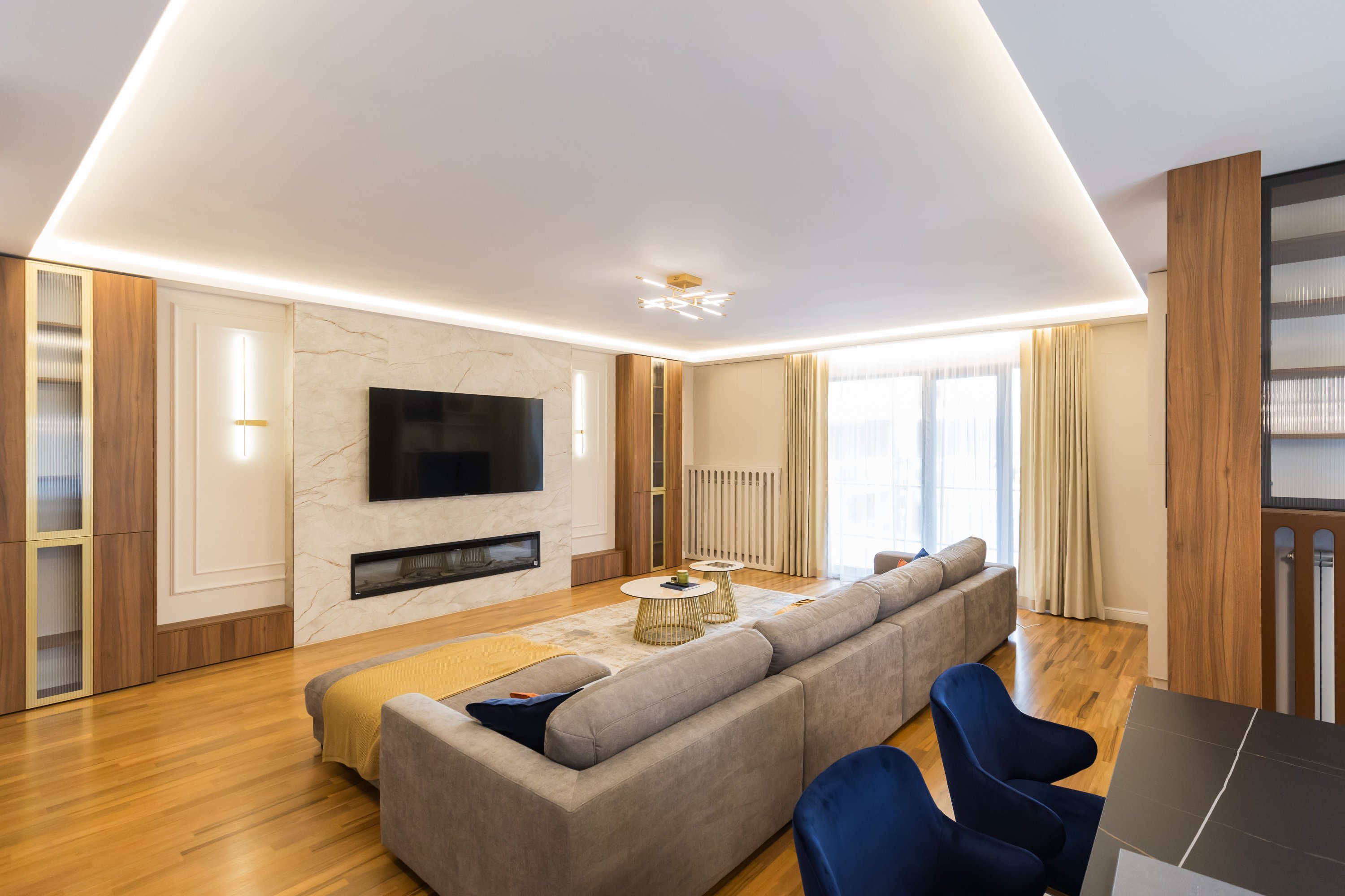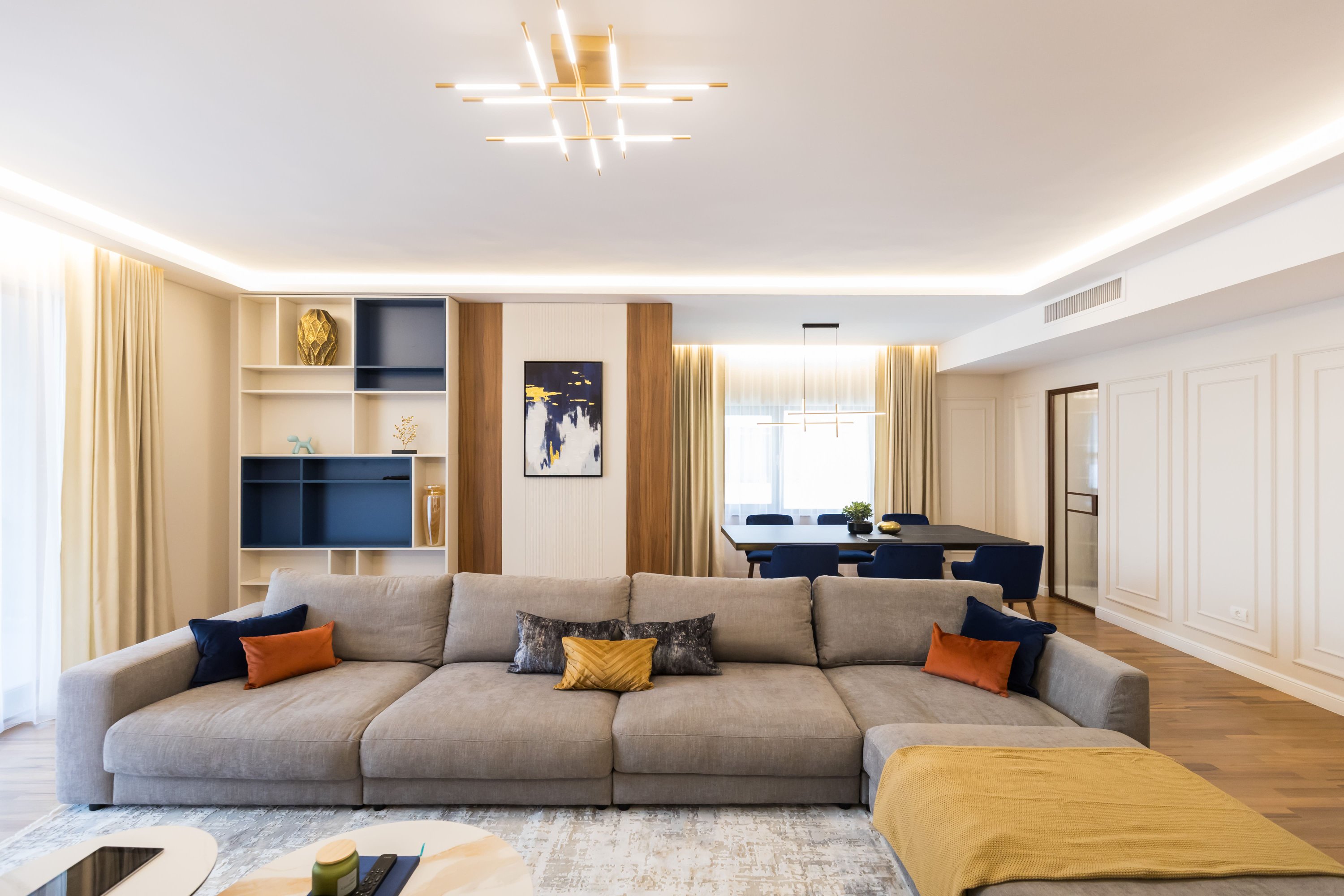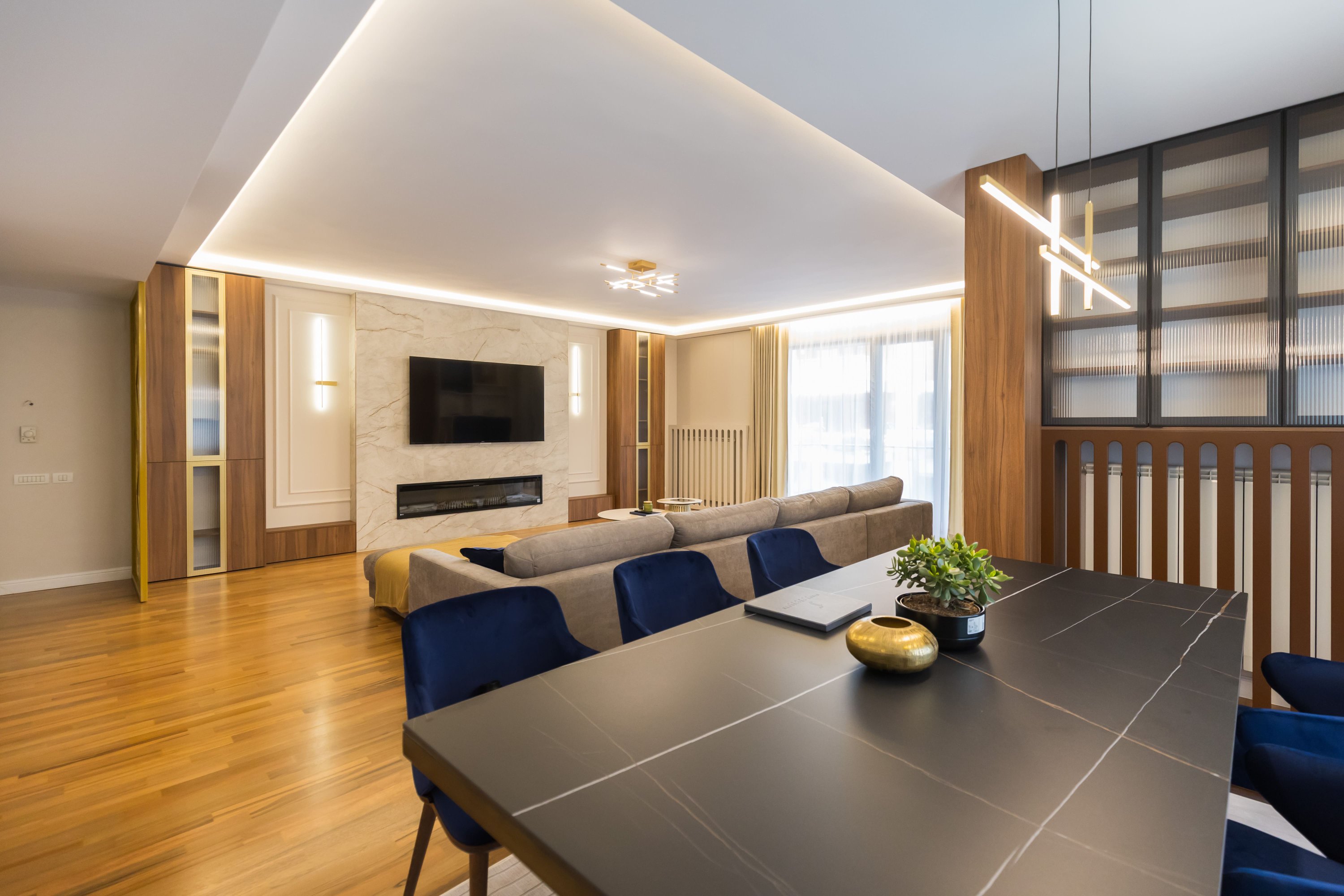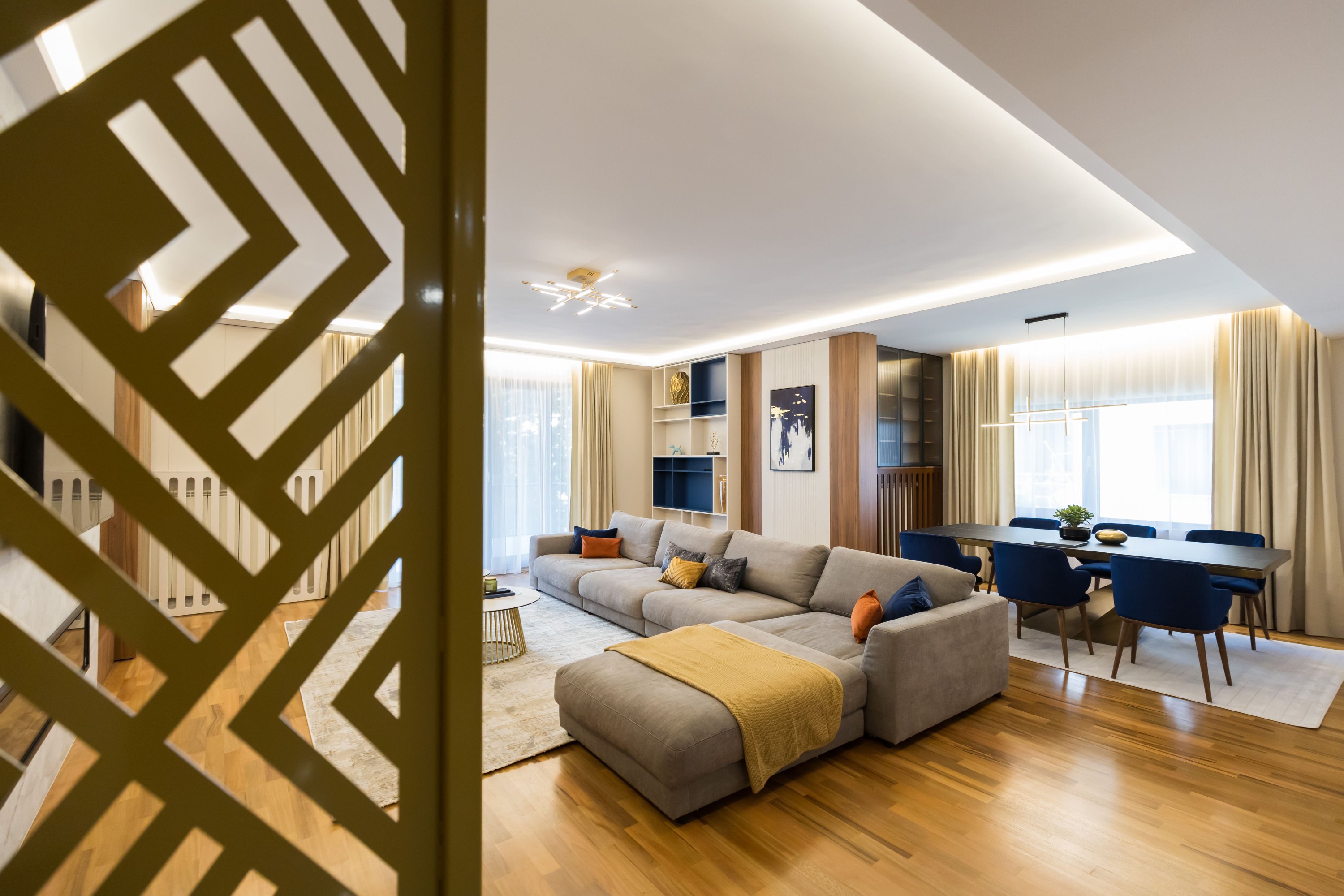 Zona de living și dormitorul sunt proiectate având în minte o paletă de culori calde, un mobilier confortabil și soluții inteligente de depozitare. Canapelele mari și zonele de relaxare invită la detensionare, în timp ce spațiile de lucru sunt optimizate pentru productivitate. Accentul pe texturi moi, cum ar fi draperiile groase și covoarele plusate, adaugă un strat de confort și rafinament. Fiecare element, de la iluminatul de accent și până la alegerile de mobilier și accesorii, este ales pentru a crea un echilibru între estetică și funcționalitate, transformând fiecare zonă într-un sanctuar personalizat și primitor.