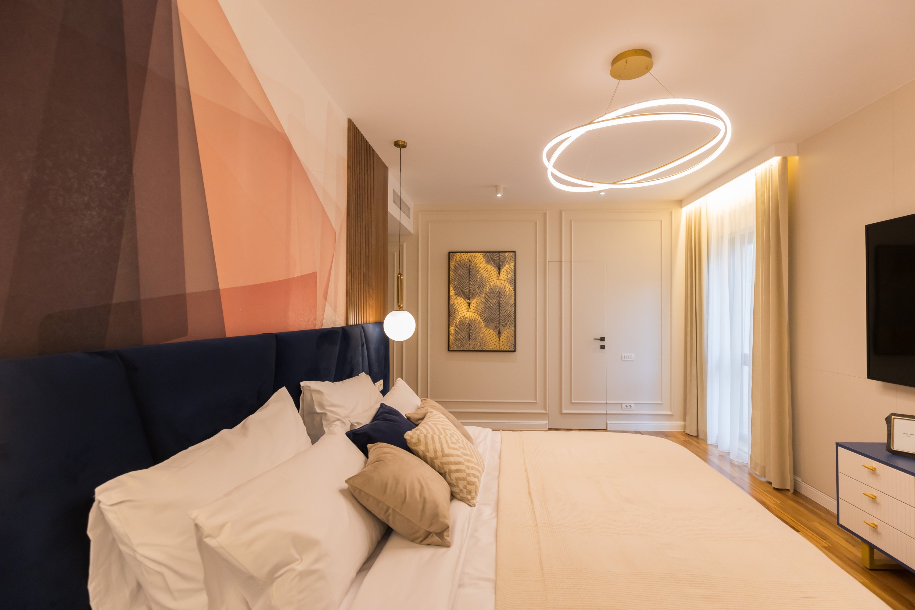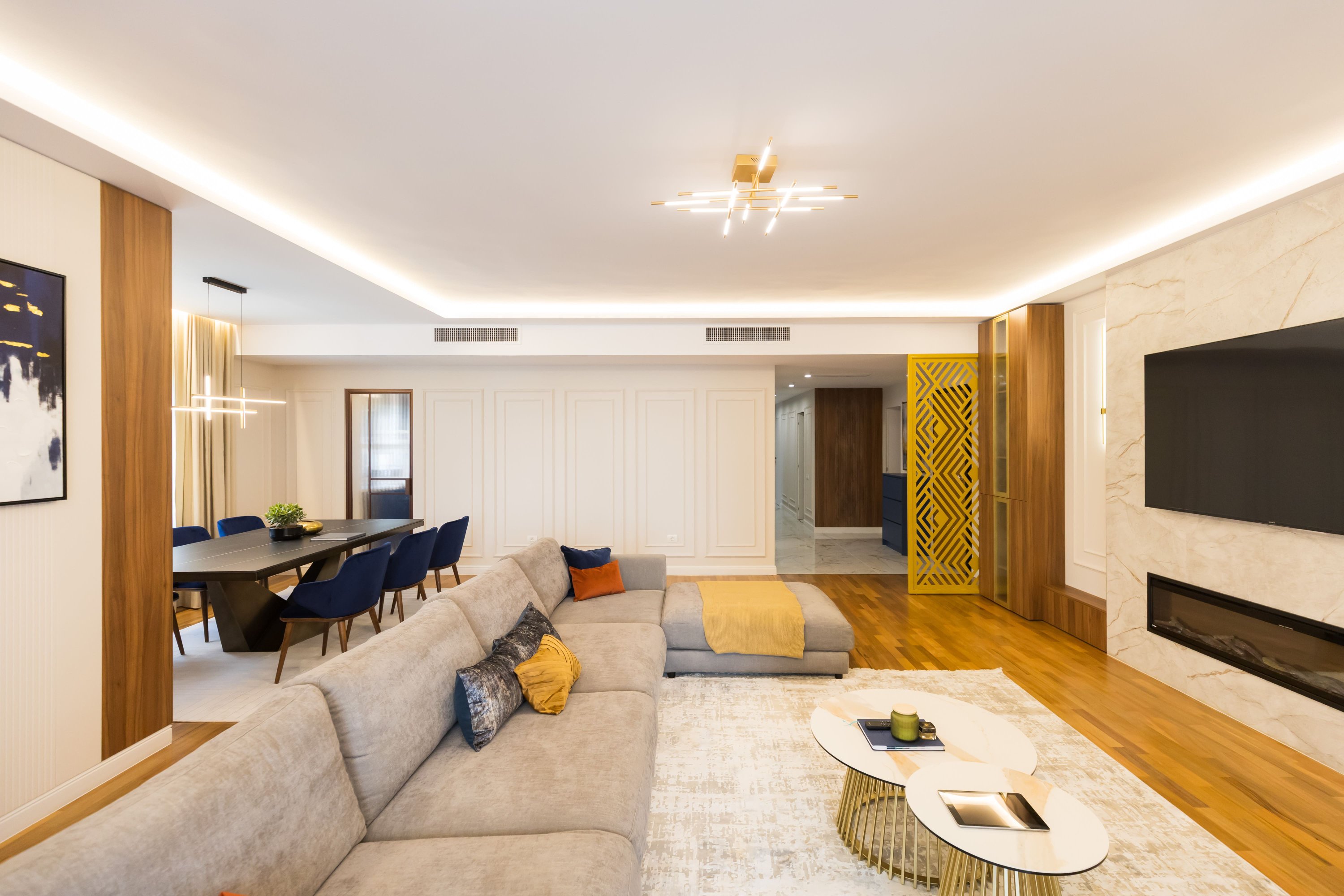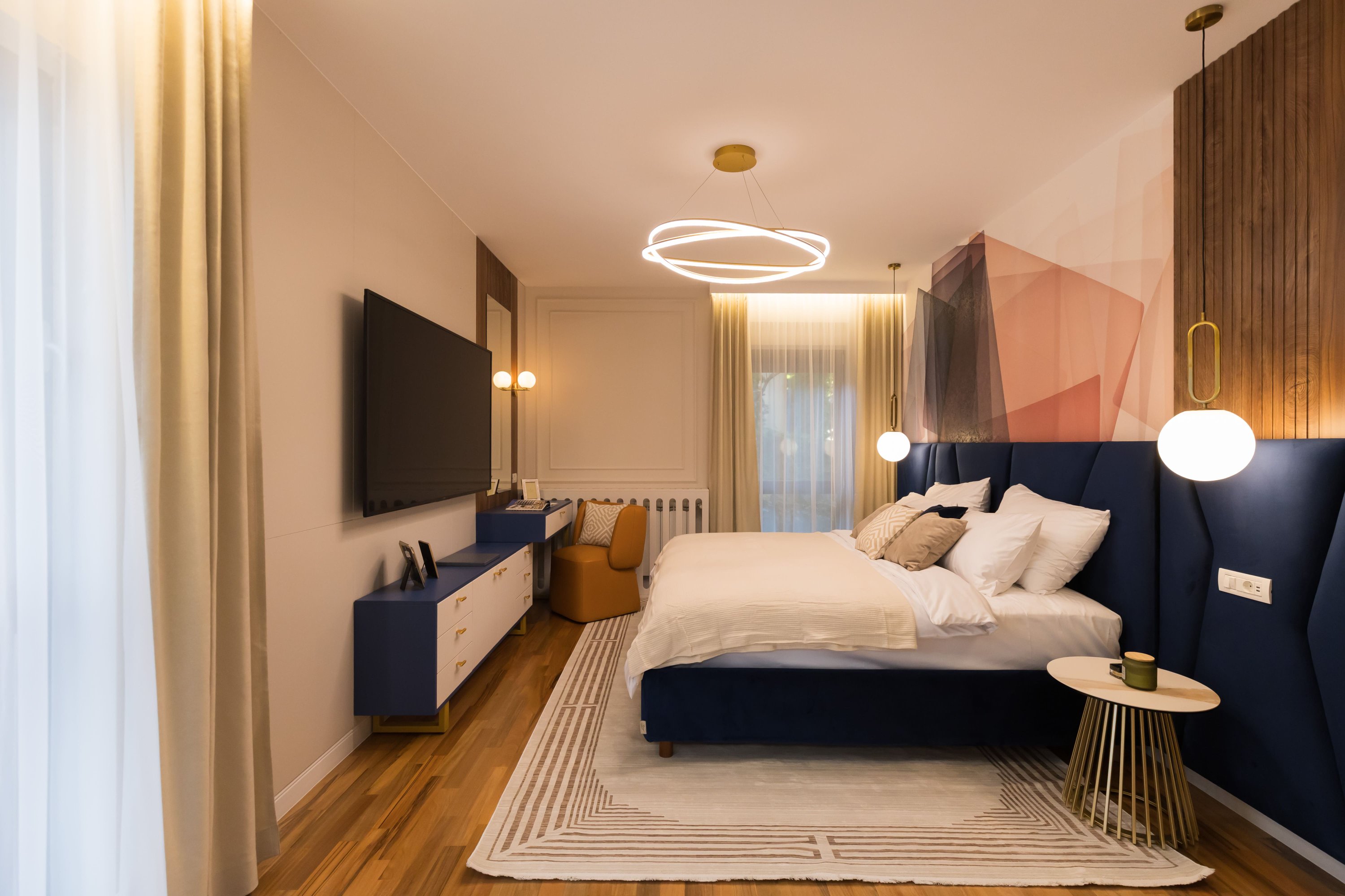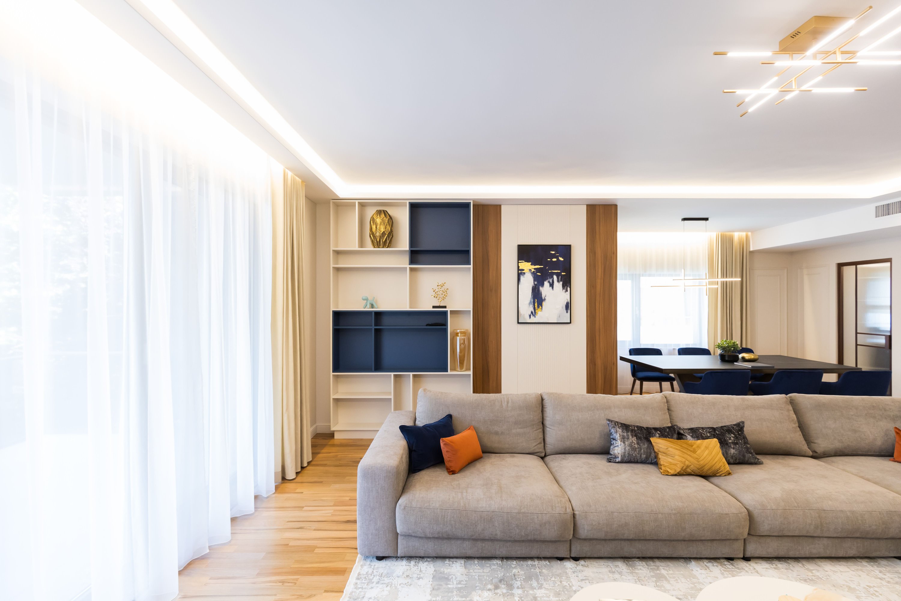 Zona de living și dormitorul sunt proiectate având în minte o paletă de culori calde, un mobilier confortabil și soluții inteligente de depozitare. Canapelele mari și zonele de relaxare invită la detensionare, în timp ce spațiile de lucru sunt optimizate pentru productivitate. Accentul pe texturi moi, cum ar fi draperiile groase și covoarele plusate, adaugă un strat de confort și rafinament. Fiecare element, de la iluminatul de accent și până la alegerile de mobilier și accesorii, este ales pentru a crea un echilibru între estetică și funcționalitate, transformând fiecare zonă într-un sanctuar personalizat și primitor.